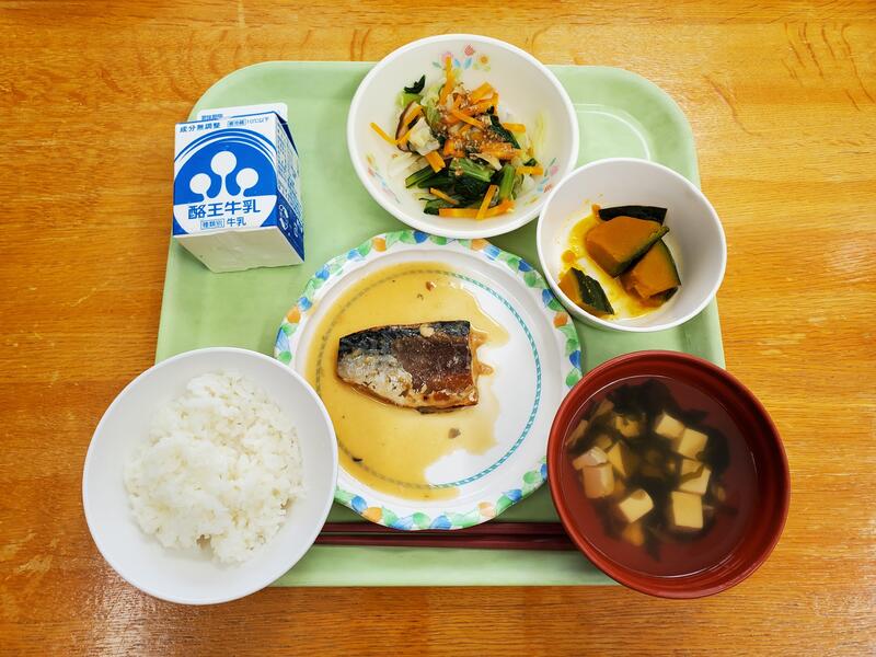 献立は、ごはん、さばの味噌煮、野菜ときのこのごま醤油和え、かぼちゃの甘煮、すまし汁(豆腐・えのき他)、牛乳です。